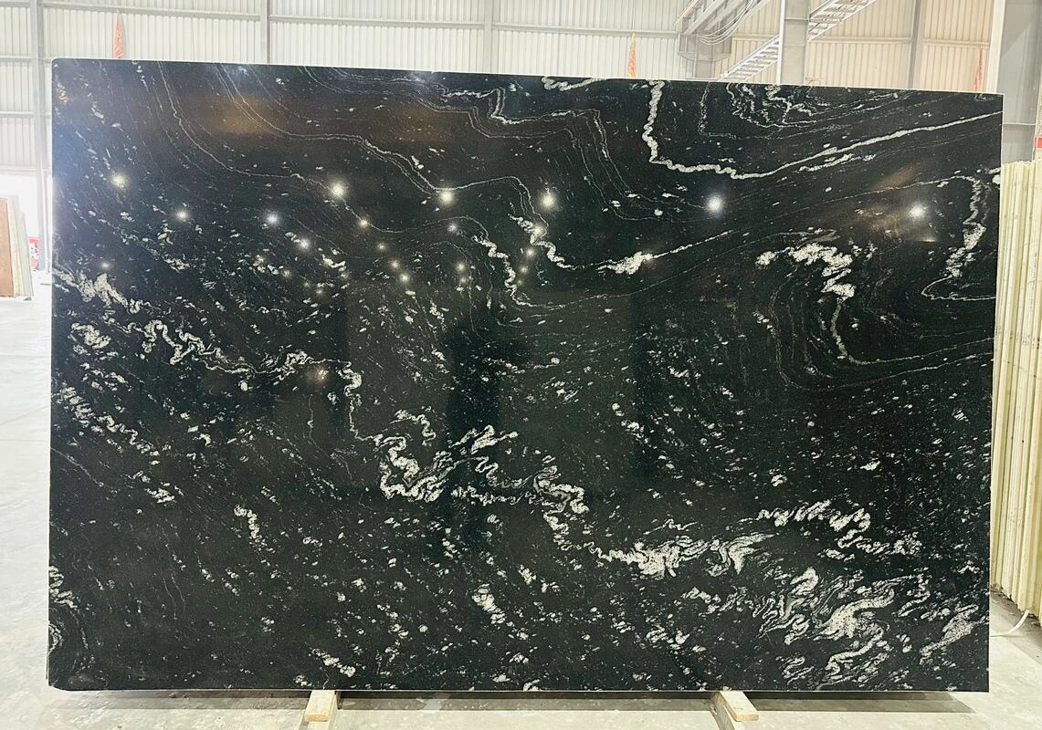Forest Black Granite features a deep black foundation with intricate white and pinkish veining that creates a striking, elegant pattern. Its flowing streaks and swirls make it a perfect choice for sophisticated interiors, adding a touch of luxury to floors, countertops, walls, and decorative elements.