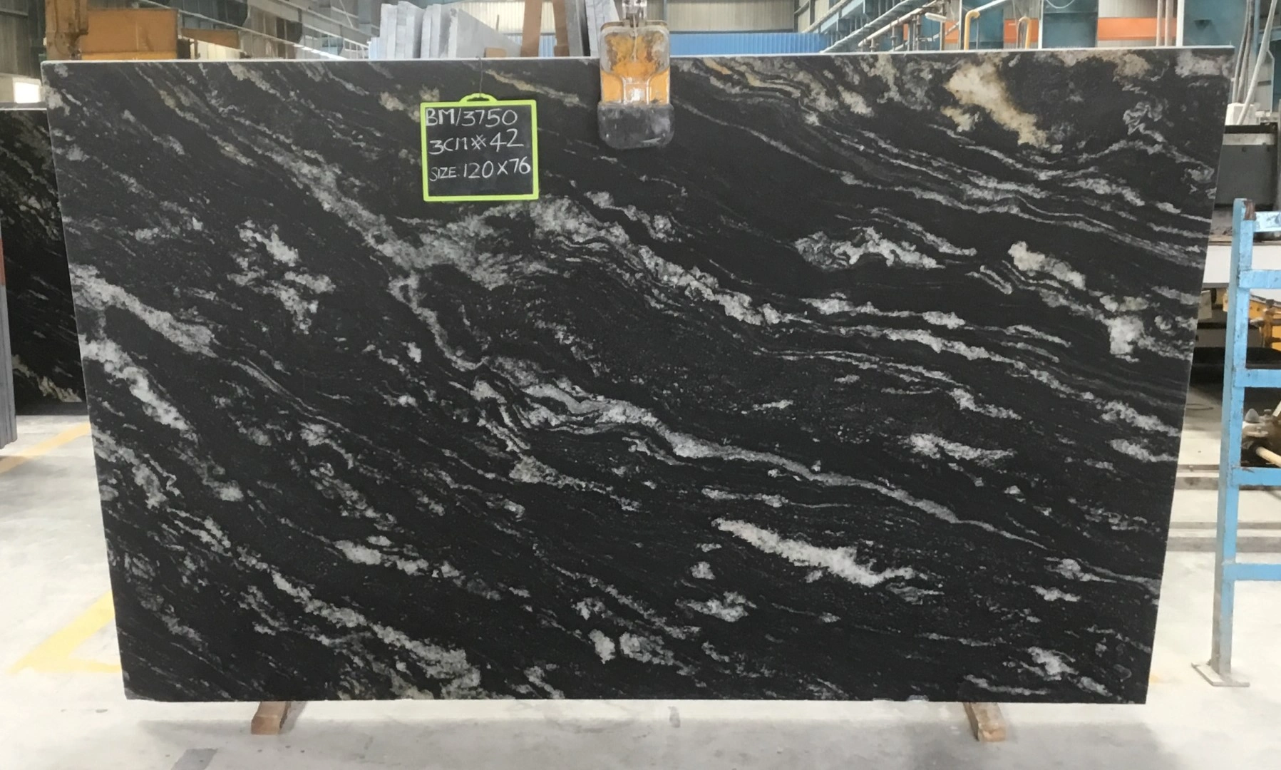 Titanium Black Granite is a premium natural stone from Rajasthan, India, celebrated for its deep black base accented by flowing veins of white, silver, and ivory. Its luxurious appearance makes it an ideal choice for sophisticated interiors, high-end countertops, feature walls, and architectural projects where elegance and modernity are desired. The dynamic veining creates a sense of movement, adding depth and character to any space.